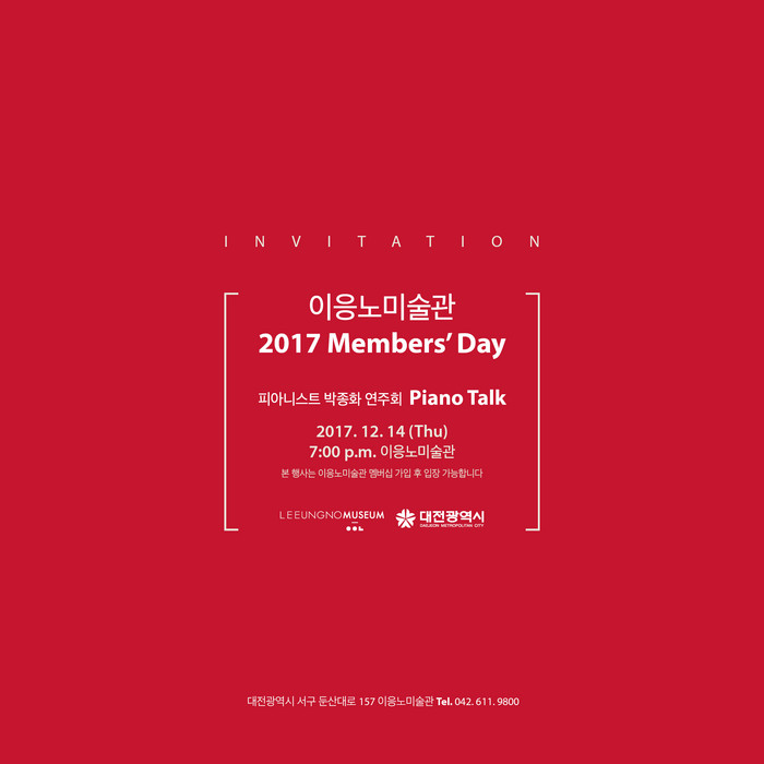 이번 행사에 대해 이지호 이응노미술관장은 “피아니스트 박종화의 연주로 진행되는 이번 콘서트가 미술관 멤버십 회원 분들께서 한 해 동안 미술관에 쏟아 주신 관심과 애정에 대한 보답의 시간이 되기를 기원하며, 뉴욕 메트로폴리탄 미술관, 국립현대미술관 등 국내외 유수의 미술관들이 멤버십 제도를 운영하고 있는 것처럼 미술관 멤버십에 가입한 관람객들이 자부심을 느낄 수 있도록 운영해 나갈 것 ”이라고 밝혔다.