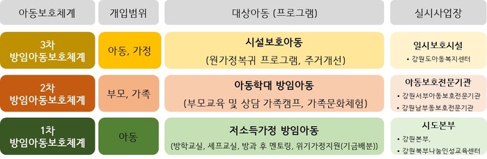 이번 프로젝트는 (사)외교부배우자회 기부금으로 진행되며, 사업 대상은 강원도 내 긴급지원이 필요한 위기가정 아동 319명이다. 방임의 위험수준에 따라 방임아동보호체계를 3차로 분류하여 프로그램을 제공하며, 아동방임 예방 및 사후연계 프로그램을 실시하고자 한다.