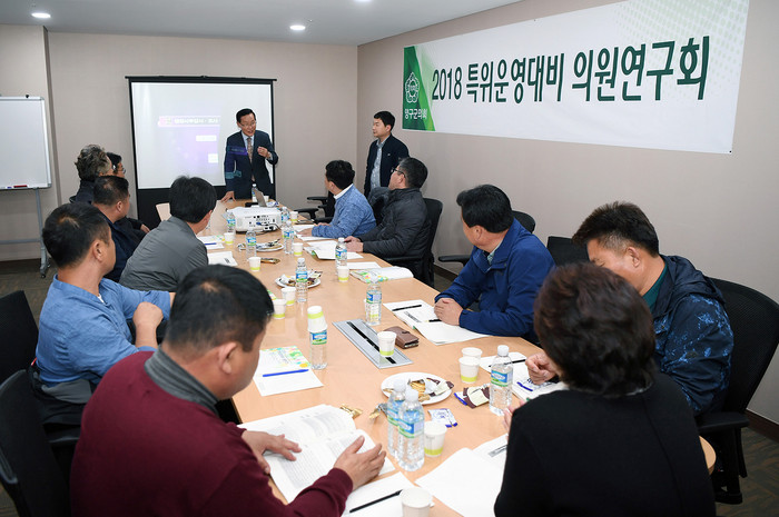 [양구군=세계타임즈 김민석 기자] 이상건 양구군의회의장, 박귀남 부의장, 의원 및 의회사무과 직원들이 13일 속초 쏘라노 분임토의실에서 서우선박사를 초청해 '행정사무감사 및 예산교육, 비행장특위 지역발전 상생방안 협의' 등의 내용으로 2018 특위운영대비 의원연구회를 개최했다.