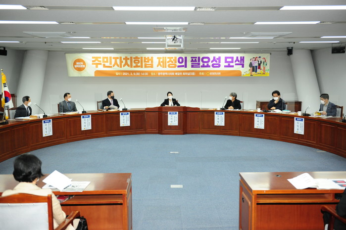 광주광역시의회 임미란(민주남구3) 의원 주최, 9일 광주시의회 예결위원회 회의실에서 ‘주민자치회법 제정의 필요성’을 주제로 토론회가 열렸다.