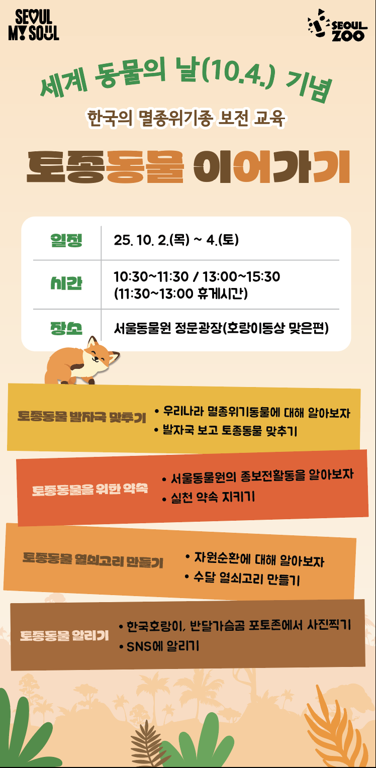 현장교육은 10월 2일(목)부터 10월 4일(토)까지이며, 1일 2회(10:30~11:30, 13:00~15:30)로 서울동물원 정문 광장에서 열린다. 동물원 관람객이라면 누구나 참여할 수 있으며, 참가자들은 부스별로 마련된 체험 프로그램을 통해 멸종위기 동물에 대해 배우고 환경보호와 관련 실천의식을 높일 수 있다.