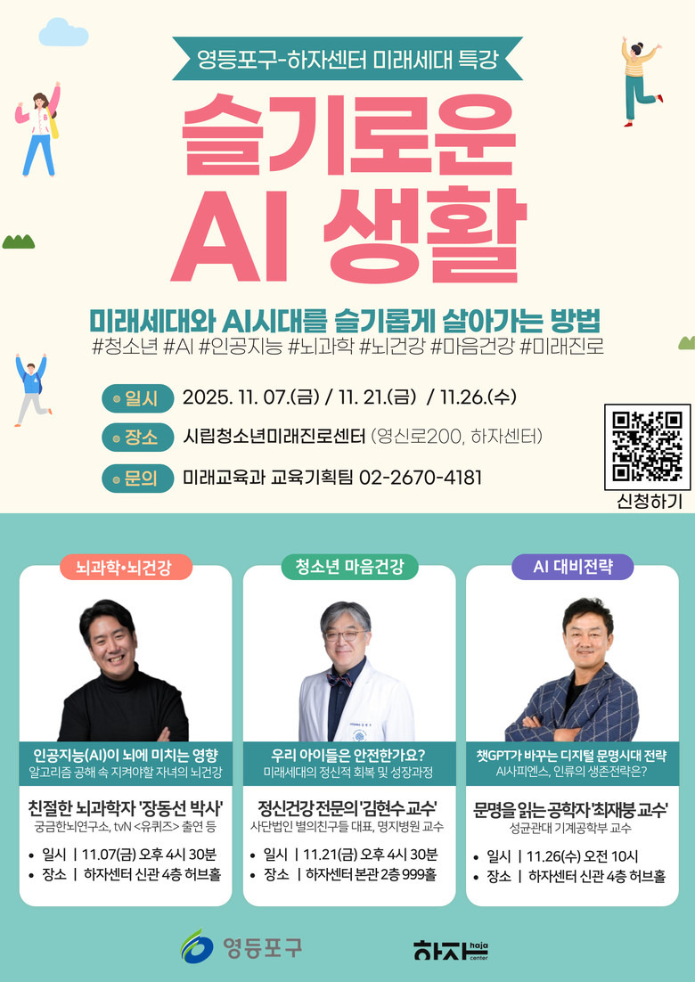 최호권 영등포구청장은 “인공지능 시대에 청소년에게 꼭 필요한 주제를 다룬 이번 강연을 통해 미래세대가 균형 잡힌 시각과 주체적인 사고력을 키우길 바란다”라며 “청소년의 올바른 성장을 지원하는 다양한 교육 프로그램을 확대해 나가겠다”라고 전했다.