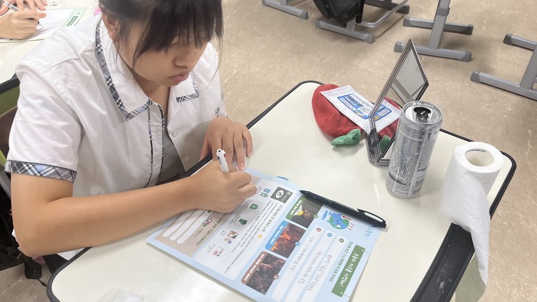 <내일의 지구를 부탁해> 교육 자료를 시청한 후 기후 위기에 대한 자신의 생각을 정리하며 후손들이 살아갈 지구의 모습에 대해 고민하는 시간을 가졌다.