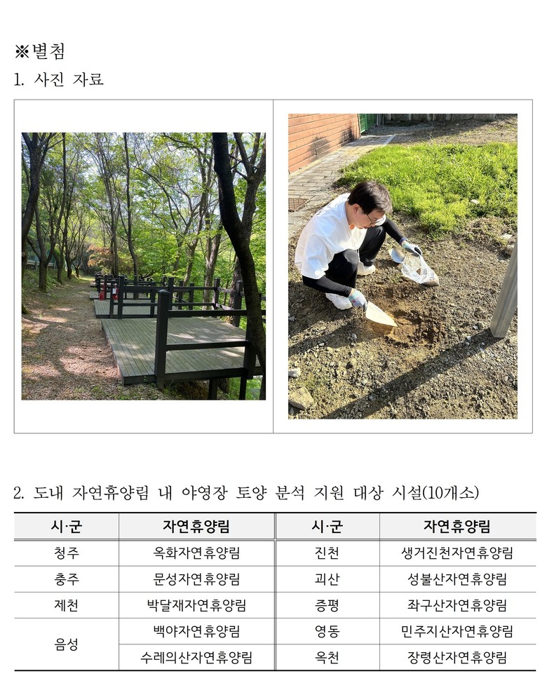 야영장 캠핑 구역 내 데크 및 주차구역 등 사람들이 주로 머무는 곳의 주변 토양을 채취하였으며, 검사 항목은 금속류 8개 항목(수은, 비소, 카드뮴, 납, 아연, 니켈, 구리, 6가크로뮴)과 기생충란 검사를 진행하였다.