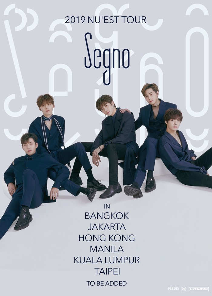 더해 뉴이스트의 해외 투어 ‘2019 NU’EST TOUR ‘Segno’’의 포스터를 추가로 공개하며 오는 7월 20일, 21일 방콕을 시작으로 7월 27일 홍콩, 8월 3일 자카르타에서 펼쳐진다는 소식을 전했고 남은 도시의 일정은 베일에 싸여 있어 궁금증을 더하고 있는 상황이다.