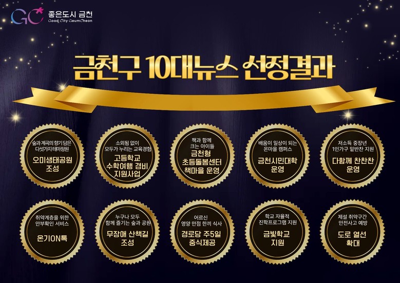 선정된 뉴스를 득표순으로 살펴보면 ▲오미생태공원 조성 ▲고등학교 수학여행 경비 지원사업 ▲금천형 초등돌봄센터 책마을 운영 ▲금천시민대학 운영 ▲저소득 중장년 1인가구 밑반찬 지원 ‘다함께 찬찬찬’ 운영 ▲취약계층을 위한 안부확인서비스 온기ON톡 ▲무장애 산책길(데크로드) 조성 ▲경로당 주5일 중식 제공 ▲금빛학교 지원 ▲도로 열선 확대 등이다.