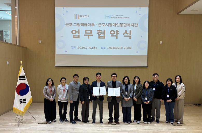 [군포시 세계타임즈=송민수 기자] 군포시 그림책 특화 복합문화공간 ‘그림책꿈마루’는 3월 19일 그림책꿈마루 아리움에서 군포장애인종합복지관(관장 유정환)과 협력체계 구축을 위한 업무협약(MOU)을 체결하였다. 이는 양 기관이 상호 신뢰를 바탕으로 지역 문화예술 발전과 시민 문화향유 기회를 확대함은 물론 지역사회 복지공동체 조성에 기여함으로써 공동의 발전을 도모하기 위함이다.