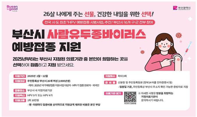 시는 지난해(2024년) 4월 「부산시 사람유두종바이러스 예방접종 지원 조례」를 제정해 소득수준과 관계없이 전국 시도 최초로 시민에게 예방접종 비용을 지원할 수 있는 근거를 마련했다.