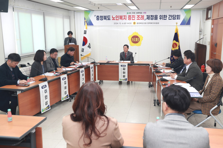 [충북 세계타임즈=이현진 기자] 충북도의회 정책복지위원회(위원장 이상식)는 6일 도의회 회의실에서 ‘충청북도 노인복지 증진 조례’ 제정을 위한 간담회를 개최했다.