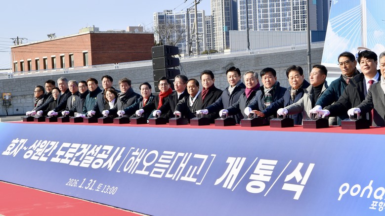 [경북 세계타임즈=한윤석 기자] 경상북도(도지사 이철우)는 31일 포항시 남구 송도동에서 북구 항구동을 잇는 해상교량(해오름대교) 건설사업인‘효자~상원 간 도로건설공사’개통식을 개최했다. 이철우 도지사, 김정재.이상휘 국회의원, 경북도의회 지역 도의원과 주민 등 300여 명이 행사에 참석했다.
