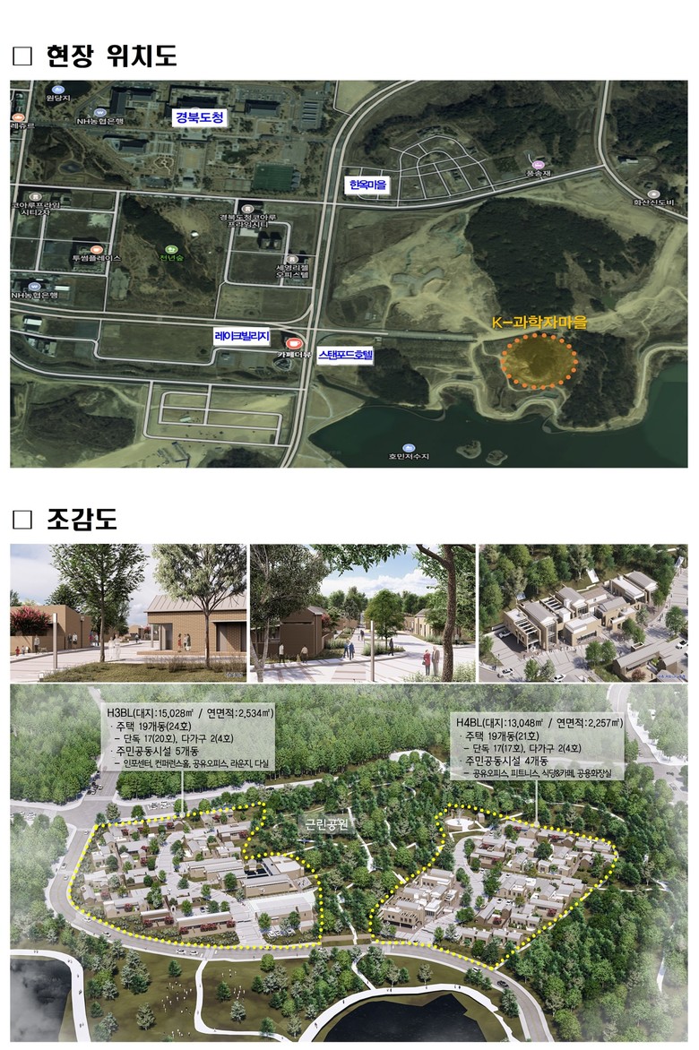 ‘K-과학자마을’은 경북도청신도시 2단계 내 검무산을 등지고 호민지를 바라보는 배산임수의 이상적 입지에 은퇴과학자의 거주와 연구, 후학 양성, 창업 등을 융합해 하나의 단지에서 동시에 이루어질 수 있도록 단독형 주택과 공유사무실, 콘퍼런스홀, 라운지 등 다양한 부대 시설을 함께 조성한다.