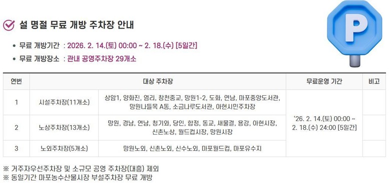 | ▲ 설연휴 마포구 무료개방 주차장 안내 |