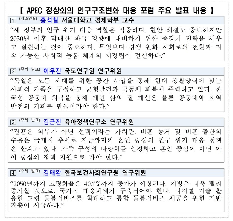 인구 관련 전문가들은 초저출생, 초고령화 등 급격한 인구구조변화에 대응하기 위해서는 ▵경쟁 완화 사회로의 전환 및 사회적 돌봄 재정립 등 국가 시스템 재설계 ▵공동체 회복을 통한 인구구조변화 극복 ▵비혼‧입양 등 다양한 가족관계 존중 및 아이 중심 정책 지원 ▵정보통신기술, AI 등을 활용한 고령 친화적 돌봄서비스 제공 및 종합적인 연계‧협력 방향으로 사회보장 전달체계 개편 등이 필요하다고 강조했다.