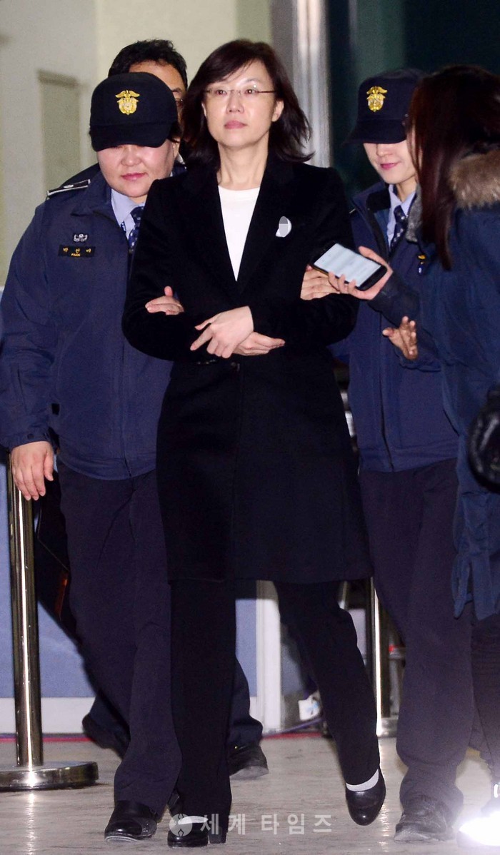 '문화계 블랙리스트' 작성에 관여한 혐의로 구속된 조윤선 전 문화체육관광부 장관이 24일 서울 강남구 대치동 특검 사무실을 나서고 있다. 2017.01.25