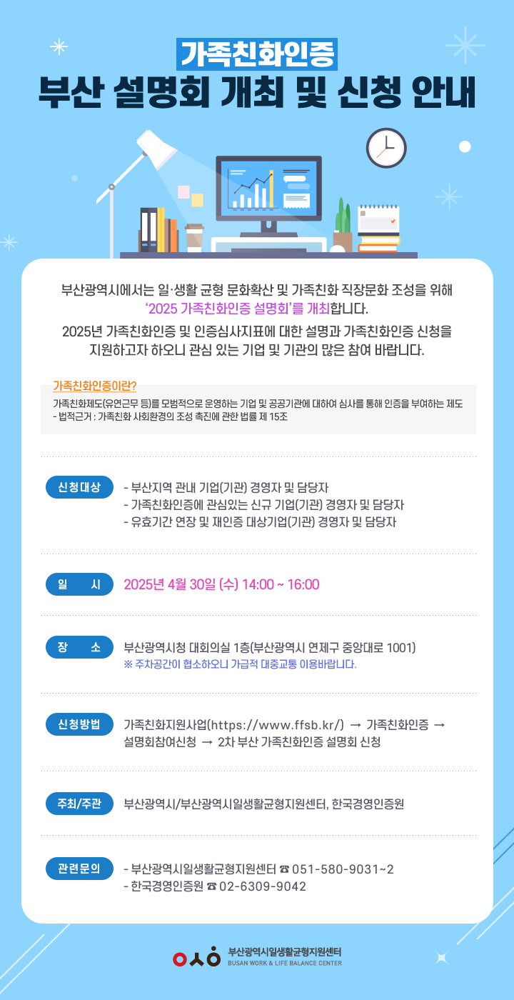 자세한 사항은 시 일·생활균형지원센터에 전화(☎ 051-580-9031~2) 또는 전자우편(hikim@wlb.or.kr)으로 문의하면 된다.