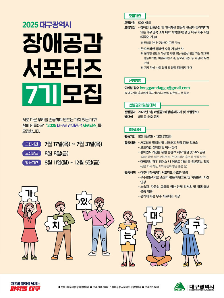 ▸ 사회관계망서비스(SNS) 등 온·오프라인 장애인식 개선활동 추진 [대구 세계타임즈=한윤석 기자] 대구광역시는 장애에 대한 올바른 이해와 공감을 넓혀 다양한 개성이 존중받는 인권공동체를 만들어갈 ‘제7기 대구시 장애공감 서포터즈’를 7월 17일(목)부터 7월 31일(목)까지 공개 모집한다.
