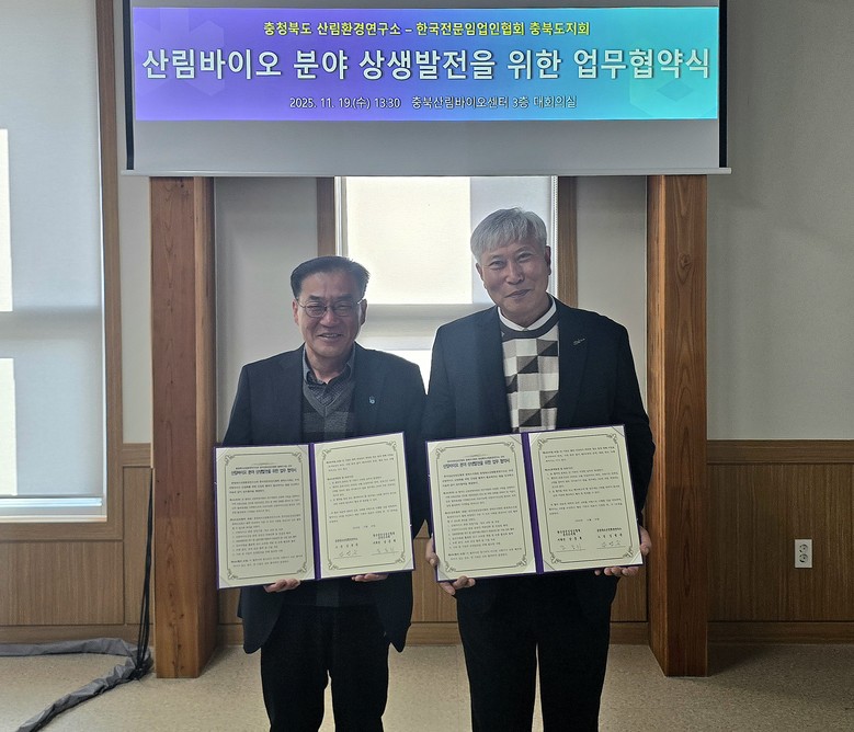 김영욱 충청북도산림환경연구소장은 “이번 협약을 통해 산림바이오센터가 보유한 산림생명자원 연구 역량과 전문임업인협회의 현장 네트워크가 결합되면 충북의 산림바이오산업 경쟁력이 한층 강화될 것”이라면서, “지역 임가의 소득 증대와 지속 가능한 산림관리 체계 구축에 실질적인 도움이 되도록 노력하겠다”고 말했다.