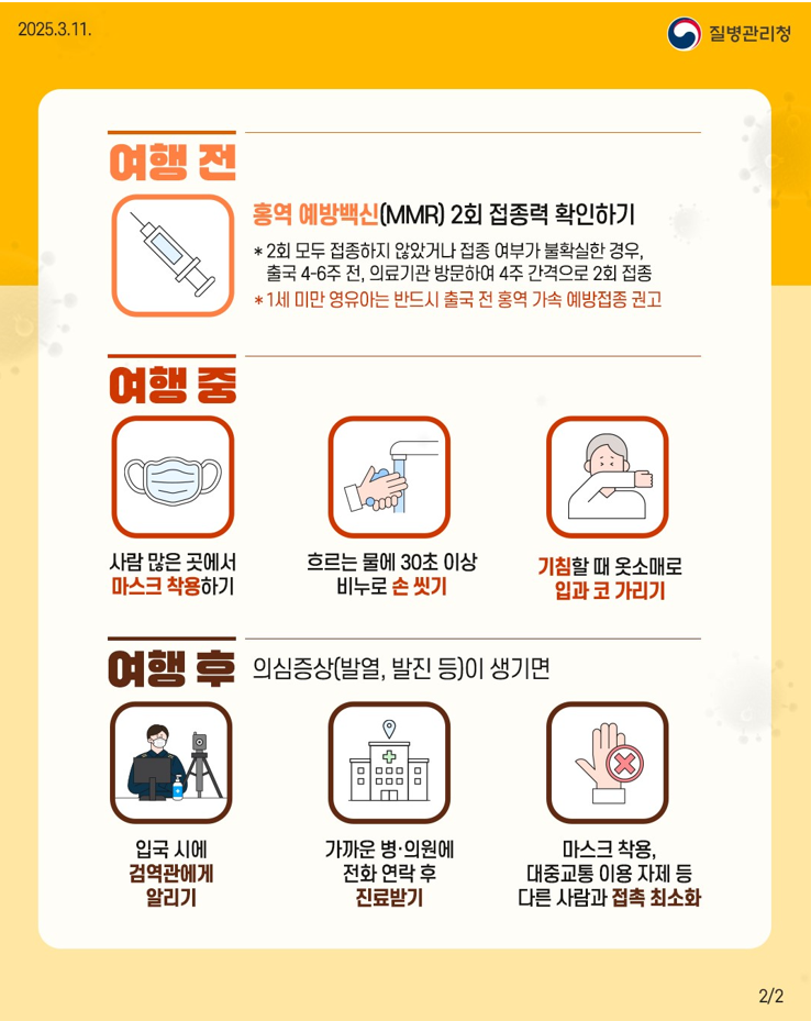 ▲여행 중에는 감염예방을 위해 손 씻기, 기침 예절 지키기 등 개인위생을 철저히 준수해야 하며, ▲여행 후 3주 이내 발열, 발진 등 홍역 의심 증상이 나타나면 타인과의 접촉을 최소화하고 ▲반드시 마스크를 착용한 뒤 ▲가까운 의료기관을 방문해 해외 여행력을 의료진에게 알리고 진료받는 것이 중요하다.