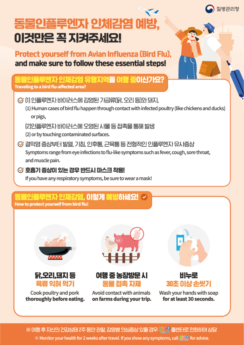 현재 국립김해공항검역소에서는 국내 입국하는 여행자를 대상으로 희망자에 한해 호흡기감염병 3종(동물인플루엔자 인체감염증, 코로나19, 인플루엔자) 검사를 무료로 시행하고 있다. 호흡기감염병 의심 증상이 있는 해외여행객은 이를 적극 활용하는 것을 권장한다.