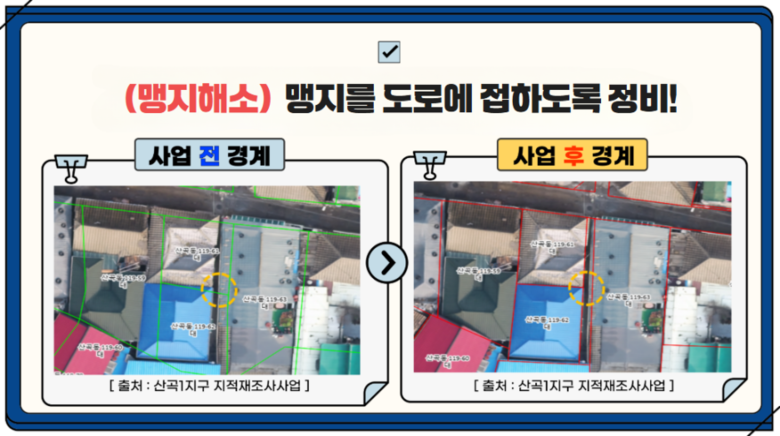 그 결과 ▲형상이 불규칙한 토지 2만 4,028필지를 반듯한 형태로 정형화했고 ▲건축물이 타인의 토지를 침범해 분쟁 소지가 있던 1만 1,474필지의 경계를 바로잡았다. 또한 ▲도로와 인접하지 않던 맹지 1,481필지를 도로에 접하도록 조정해 시민 불편을 해소한 것으로 나타났다.
