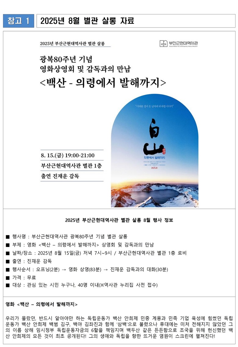 광복절 당일인 8월 15일 저녁 7시 별관에서는 역사관 별관 살롱으로 독립운동가 백산 안희제 선생의 생애와 독립운동의 발자취를 담은 영화 <백산-의령에서 발해까지>를 관람하고 감독과 대화를 나누는 시간을 마련했다.
