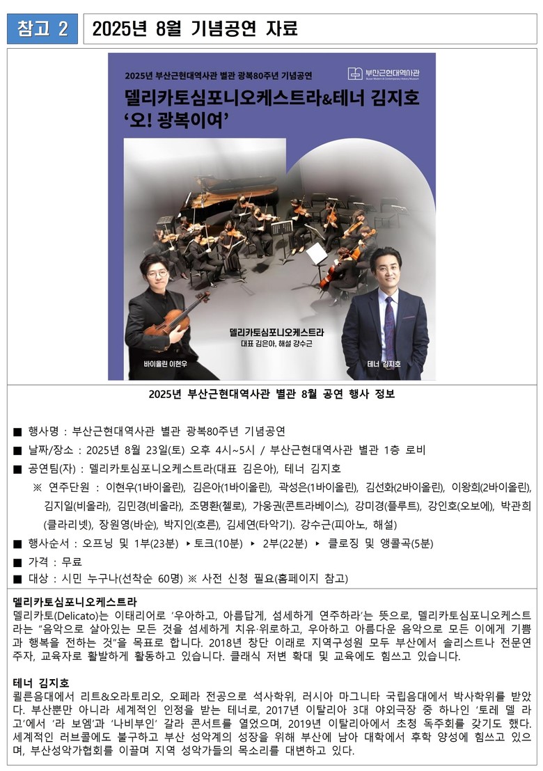 ◈ 8.23. 16:00 광복 80주년 기념 공연… 광복의 의미를 되새기기 위한 델리카토심포니오케스트라, 테너 김지호 출연 음악회 개최