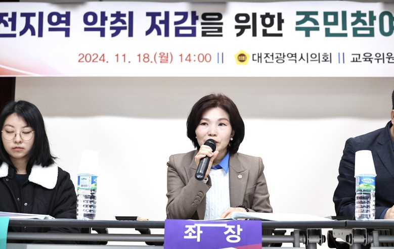 [대전 세계타임즈=이채봉 기자] 대전시의회 교육위원회는 18일 북부여성가족원 3층 시청각실에서 지역주민들의 악취로 인한 불편사항과 고충을 청취하고, 대전시와 유성구, 대덕구의 악취저감을 위한 구체적인 정책방향 설명과 함께 시민 불편 해소를 위한 대책을 숙의하고자‘북대전지역 악취 저감을 위한 주민참여 정책간담회’를 개최했다.