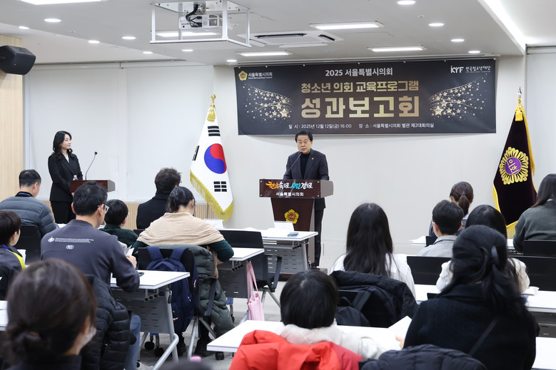 이날 성과보고회는 서울시의회가 추진한 청소년 의회 교육프로그램의 운영 성과를 공유하고 향후 발전방안을 논의하기 위해 마련됐으며, 김 의원을 비롯해 문성호 시의원, 의회사무처 관계자, 청소년 의회 참여 청소년과 학부모, 교사 등 총 40여 명이 참석했다.