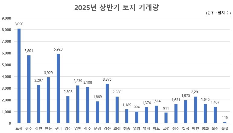 또한, 작년 하반기 대비 올해 상반기 토지거래량은 경북뿐만 아니라 대구 19.3%, 제주 16.3%, 강원 15.23% 등 12개 시도가 감소했으며, 세종(16.0%), 울산(10.5%), 광주(8.6%) 등 5개 시도는 증가했다.