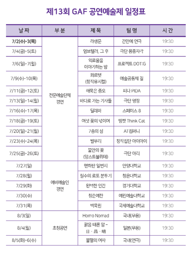 올해 7월 1일부터 8월 9일까지 39일간 진행하는 본 행사는, 전 공연 입장권 무료이며, 7월 2일에서 8월 6일까지 ▲예술인 행사(전문 예술인, 예비 예술인, 해외(일본) 초청 공연)와 7월 1일에서 8월 9일까지 ▲지역민 행사(시민문화예술 교육프로그램, 취약계층 예술프로그램 등/ 거리 야외무대 운영(8.9.))가 이어진다. 그리고, 8월 7일 폐막식(폐막공연 및 리셉션) 이후에도 8월 9일 GAF 야외무대에서는 ‘거리 야외무대’(문화예술교육 체험부스, 버스킹 공연, 매직쇼, 버블쇼)가 펼쳐져, 로컬 예술 공연을 통한 지역 시민들의 문화예술 활동도 장려할 수 있을 것으로 기대된다.