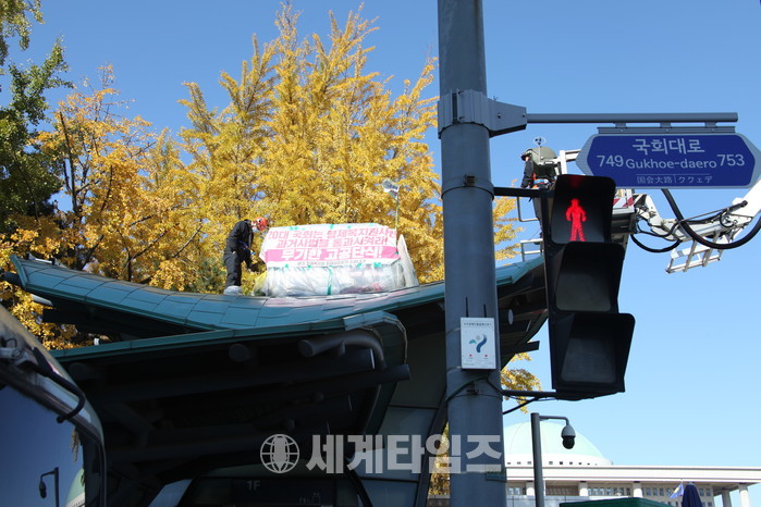 지난 6일 국회정문 앞 ‘형제복지원사건 진상규명 과거사법제정촉구’농성을 729일간 이어온 최승우 씨는 국회 앞 5미터 높이 지하철 엘리베이터 지붕 위에서 고공농성에 들어갔다.