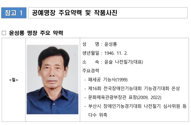 「부산광역시 공예명장」은 공예 문화산업 현장에서 최고 수준의 숙련 기술을 보유하고, 장기간 공예 기술 발전과 공예인의 지위 향상에 기여한 시민에게 주어지는 영예로운 자격이다.