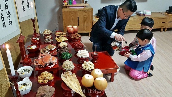 설 명절인 28일 전북 익산시의 한 가정에서 어린 아이들이 조상을 위해 마련한 차례상에 술을 올리고 있다. 2017.01.28. (사진=시민 제공)