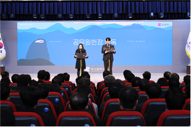 이날 시무식은 '다시 태어나도 살고 싶은 부산'을 만들겠다는 의지를 담은 영상 상영을 시작으로 ▲시책추진 유공 및 으뜸부서 시상 ▲박 시장의 신년사 순으로 진행됐다.