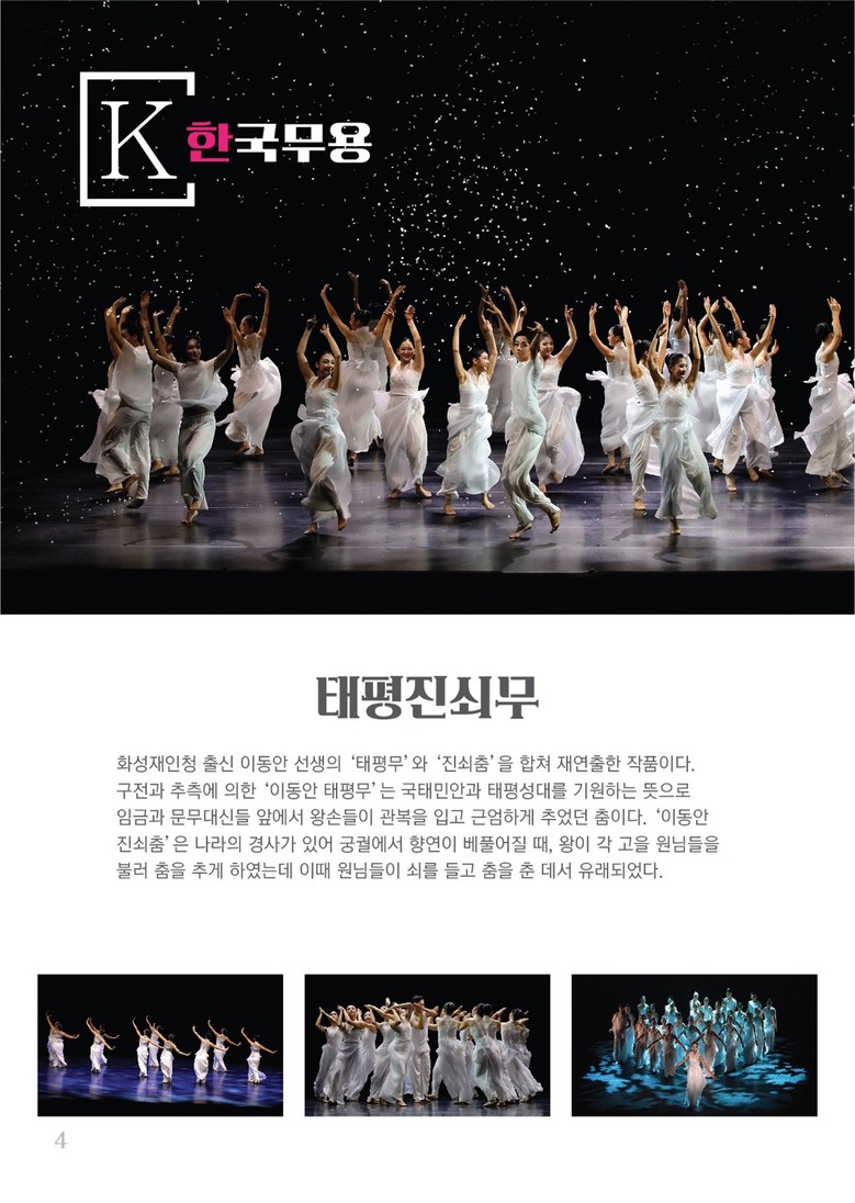 한국무용은 이동안 선생의 ‘태평무’와‘진쇠춤’을 합쳐 재연출한 ‘태평진쇠무’와 금무타악기인 향발을 들고 왕을 송축하는 ‘향발무’를 새롭게 재구성하여 선보일 예정이다. 발레는 마리우스 프티파가 안무한 ‘해적’의 3막을 다채롭게 재구성하여 아름담고 화려한 무대를 선보인다. 또한, 현대무용은 ‘우리만의 세상’을 통해 학생들이 ‘나’를 찾아가는 과정을 진지하고 또 때로는 코믹하게 연출하여 자유분방하고 다양한 몸짓을 선보일 예정이다.