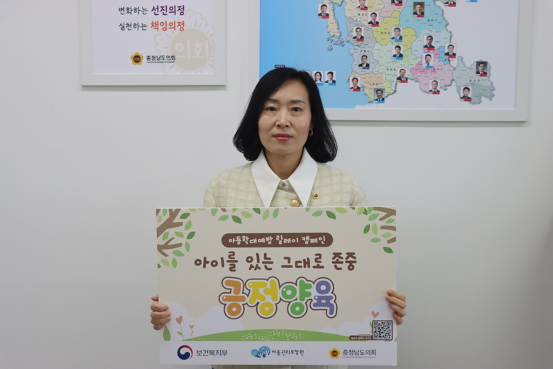 이어 신 의원은 “아이들은 자신이 존중받고 있다고 느낄 때, 사회에서도 긍정적이고 건강한 인간관계를 형성할 수 있고, 더 나은 사회를 만들 수 있다”며 “충남도의회 내에서도 이 캠페인을 적극적으로 확산시켜 아동학대 예방에 대한 인식을 높일 것”이라고 밝혔다.