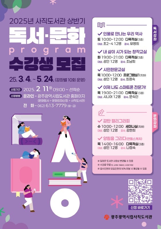 상반기 독서문화 강좌의 수강료는 무료이지만 재료비와 교재비는 수강생이 부담한다. 강좌 수강을 희망하는 시민은 11일부터 광주광역시립도서관 누리집(홈페이지)의 ‘문화강좌신청’란을 통해 접수할 수 있다.