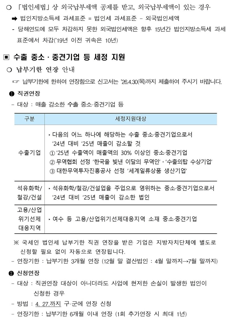 또한, 직권 연장 대상이 아니어도 사업에 현저한 손실이 발생한 법인은 「지방세기본법」에 따라 4월 24일까지 사업장 소재지 관할 구·군 세무부서에 납부 기한 연장 신청을 하면, 납부 기한을 6개월 이내로 연장할 수 있다. 연장은 2회까지 가능하며, 최대 1년까지 연장할 수 있다.