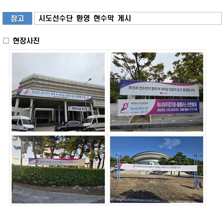 한편, 시는 환영 분위기 확산을 위해 부산 주요 도심과 행사장 일대에 환영 현수막을 게시해, 선수단이 부산의 진심 어린 환영을 체감할 수 있도록 했다.