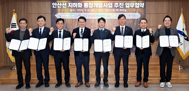 | ▲ 이민근 안산시장이 2026년 3월 6일 _안산선 지하화 통합개발사업 추진 업무협약식_에서 참석자들과 함께 기념촬영을 하고있다. |