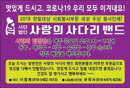 대전발달장애인부모협회 김명숙 회장은 “매월 1회 사랑의 사다리 밴드에서 맛있는 밑반찬을 지원해 주어서 큰 힘과 위안이 된다.”면서 감사함을 전했다.