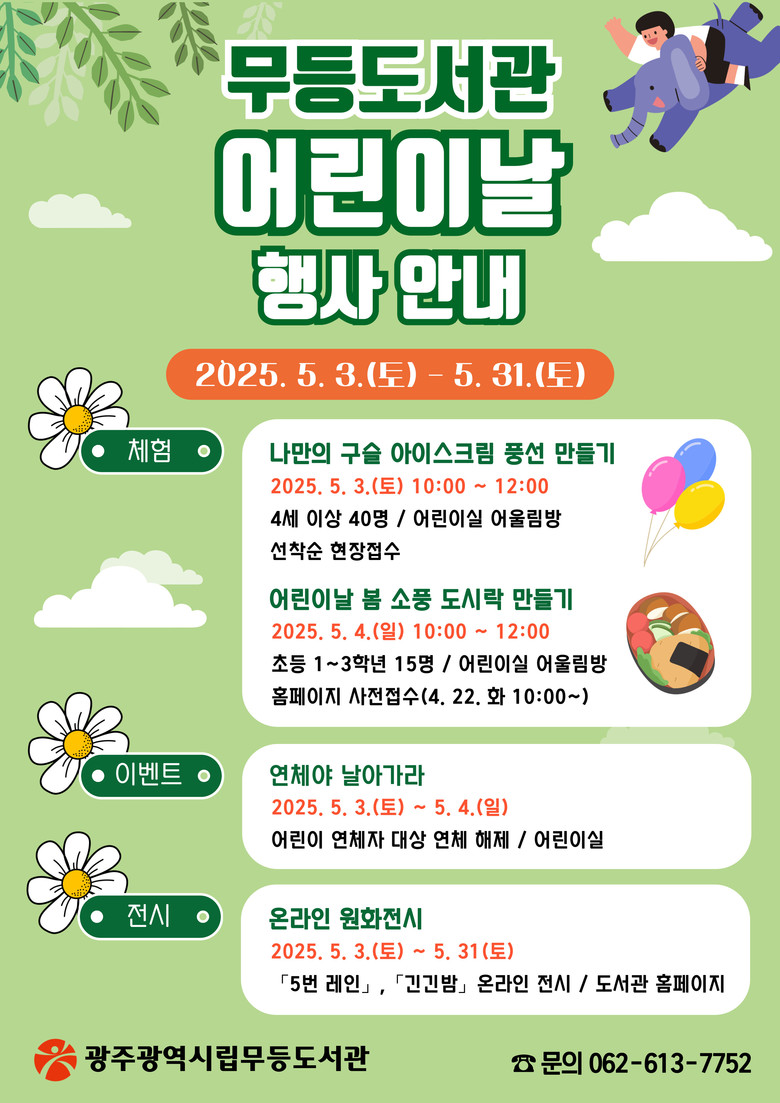 무등도서관은 어린이를 대상으로 ▲나만의 구슬풍선 꾸미기 체험(5월 3일) ▲봄 소풍 도시락 만들기 체험(5월 4일)을 진행한다. 아동 도서 ‘5번 레인’, ‘긴긴밤’의 온라인 원화 전시도 운영한다. 특히 이번 행사기간 중 연체 아동 회원을 대상으로 연체기록 해제 서비스를 제공한다.