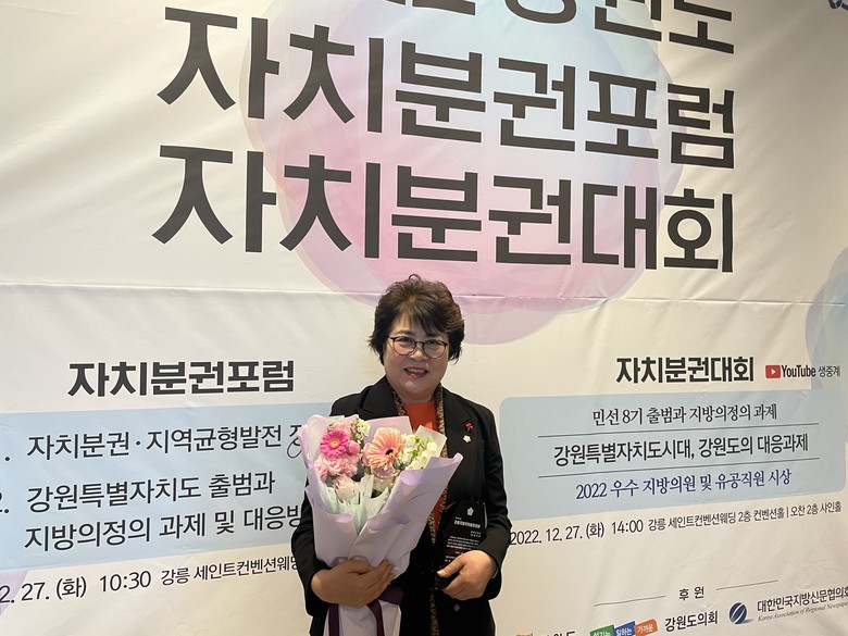 [동해시 세계타임즈=김민석 기자] 민귀희 동해시의회 의원은 2022 강원도 자치분권대회에 참석하여 지역사회와 지방의정 발전에 기여한 공로를 인정받아 「2022 강원지방자치발전대상」을 수상했다.