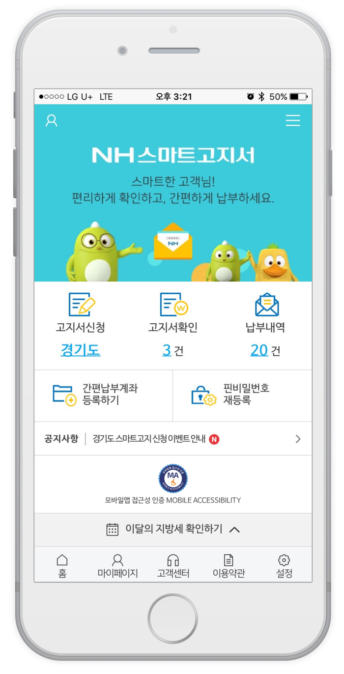 지난 15일 경기도청이 주관한 ‘스마트 고지와 핀테크 기반의 지능형 세정서비스 구축 최종보고회’에서 NH농협은행 ‘NH스마트고지서’의 앱서비스가 매우 우수하다는 평가를 받았다.