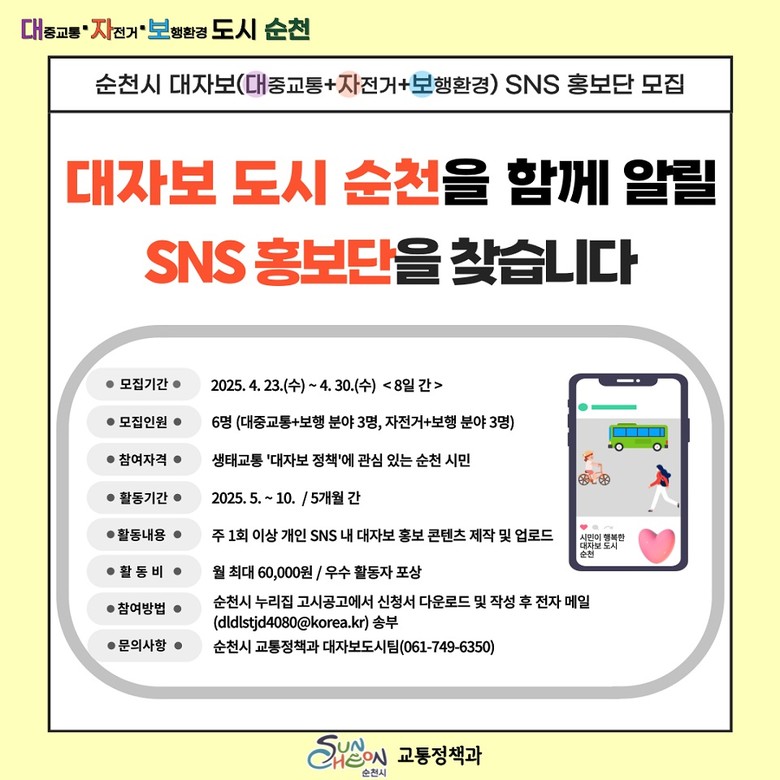 [순천시 세계타임즈=우덕현 기자] 순천시(시장 노관규)는 대중교통과 자전거, 보행환경 등 주요 정책의 홍보를 위한 ‘2025년 대자보 SNS 홍보단’을 오는 30일까지 모집한다고 밝혔다.