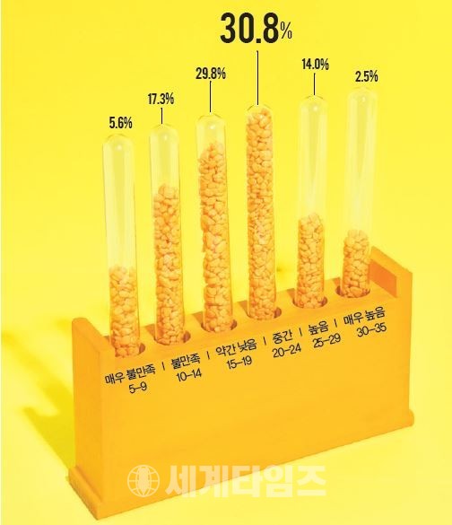 비율로 보면 ‘중간(30.8%)’과 ‘약간 낮음(29.8%)’이라는 응답이 가장 높아 각자 생각하는 행복의 기준에 약간 못미치는 정도를 보였다.