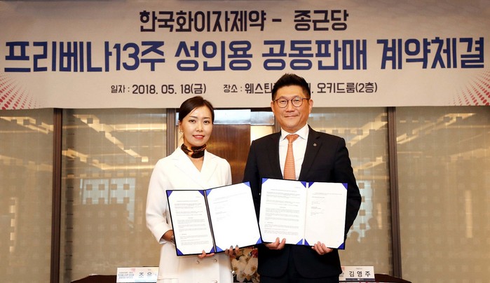 ㈜종근당 김영주 대표는 “지난 5개월 간의 유통 제휴를 통해 양사가 지닌 강점을 확인했으며 향후 판촉과 판매 영역에 있어서도 강력한 시너지 효과를 낼 수 있을 것”이라며 “최근 급격한 고령화에 따라 성인 백신의 중요성이 높아지고 있는 만큼 프리베나®13주의 성장을 가속화하기 위해 적극적으로 협업하겠다”고 전했다.