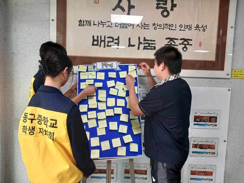 동구중학교 학생들은 노란 메모지에 추모의 글을 적고, 추모의 뜻을 담은 스티커를 나누며 참사에 대한 기억과 공감의 시간을 가졌다.