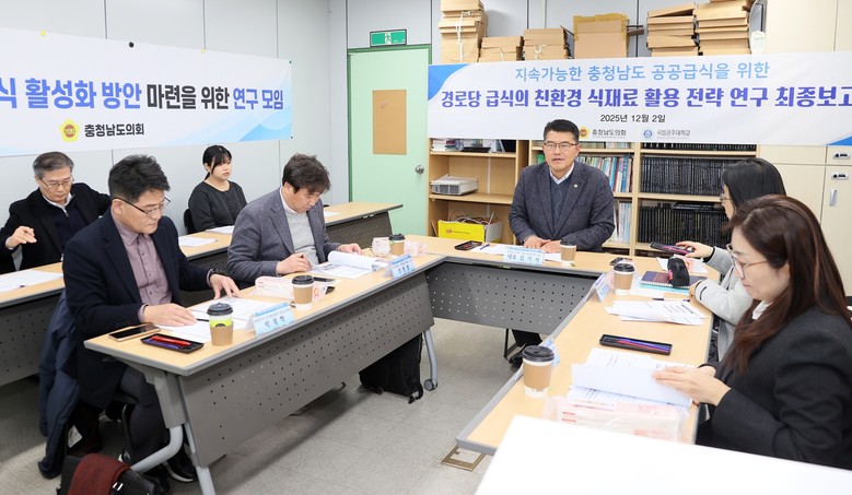 도의회 ‘공공급식 활성화 방안 마련을 위한 연구모임(대표 김기서)’이 2일 국립공주대학교 예산캠퍼스 산업과학관 세미나실에서 제3차 회의 및 연구용역 최종보고회를 열고, 충남형 경로당 공공급식 모델 구축 방안을 최종 점검했다.