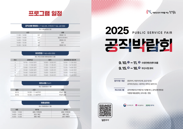 인사혁신처(처장 최동석)는 중앙행정기관, 지방자치단체, 공공기관 등이 참여하여 다양한 공직 채용 정보를 제공하는 ‘2025 공직박람회’를 15일부터 16일까지 이틀간 부산시청 1, 2층(로비)에서 개최한다고 밝혔다.